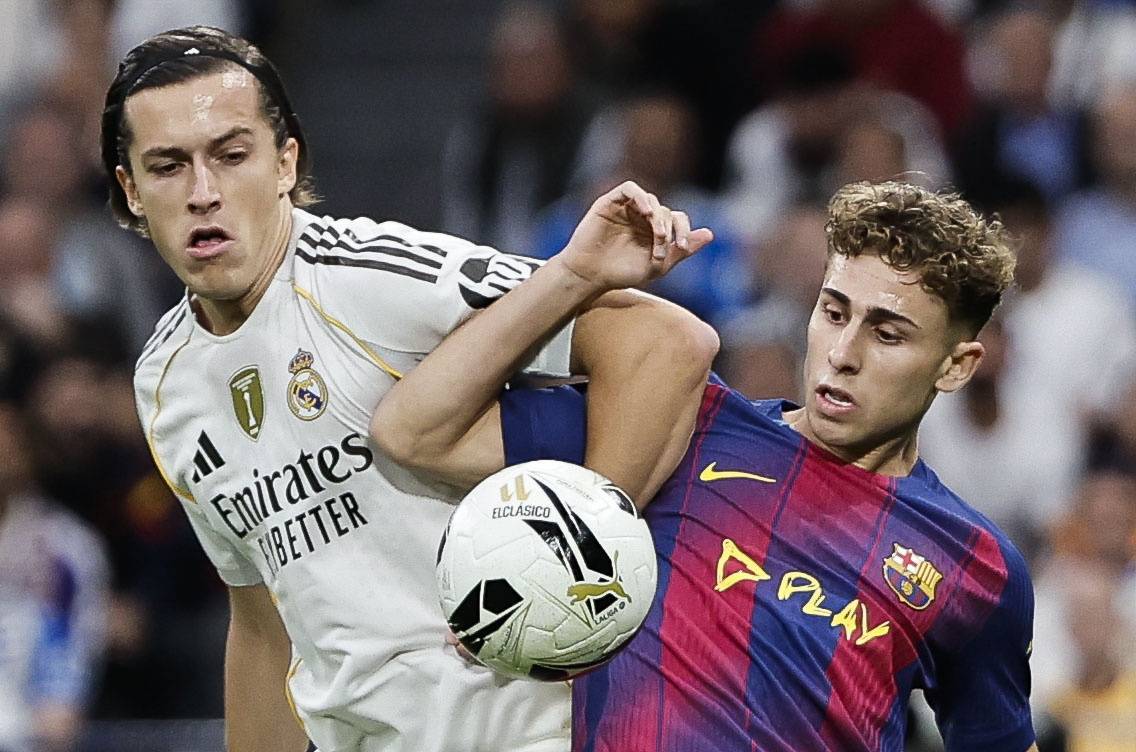 10月26日,皇家马德里队球员卡马文加(右)与巴塞罗那队球员佩德里拼抢。 新华社/欧新